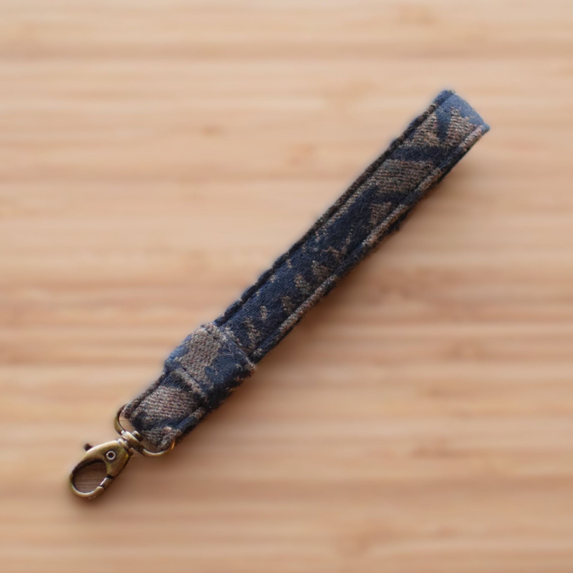 Smuk nøglering med karabin. Viklestoffet er fra Sling Studio med sort bomuldskanvas som bagside. Længde ca. 20 cm.