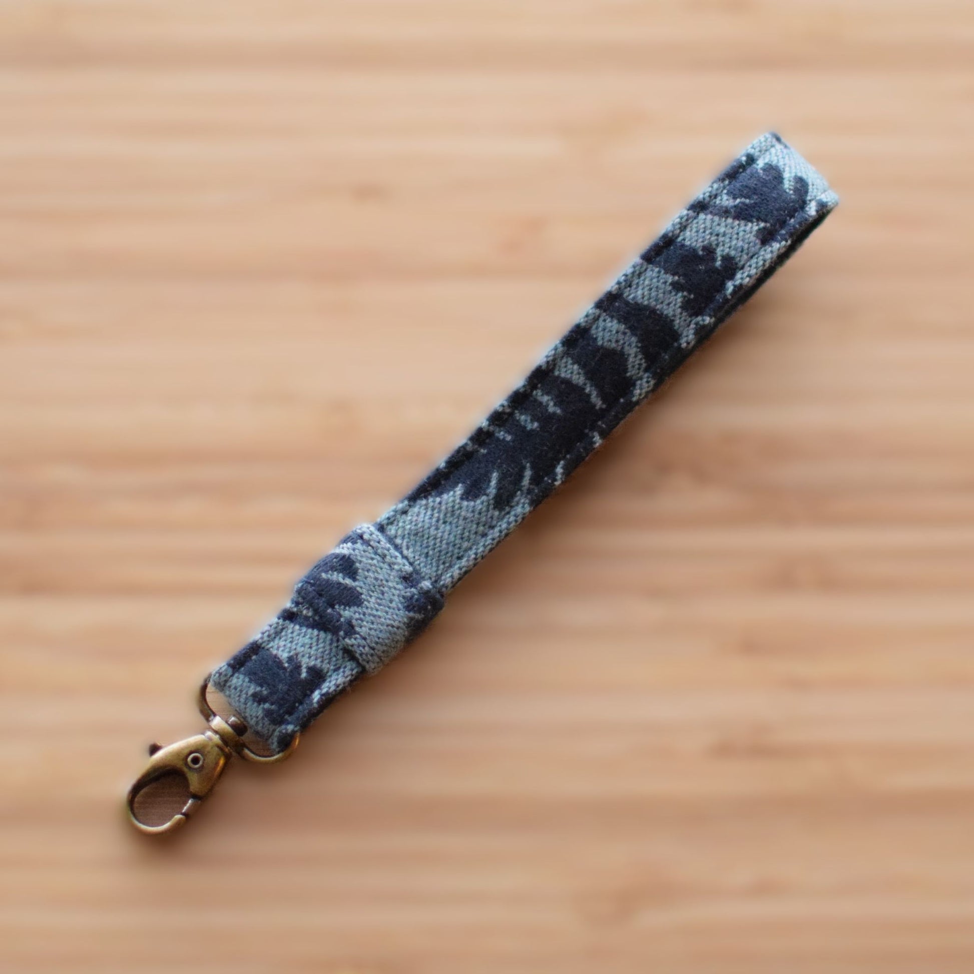 Smuk nøglering med karabin. Viklestoffet er fra Sling Studio med sort bomuldskanvas som bagside. Længde ca. 20 cm.