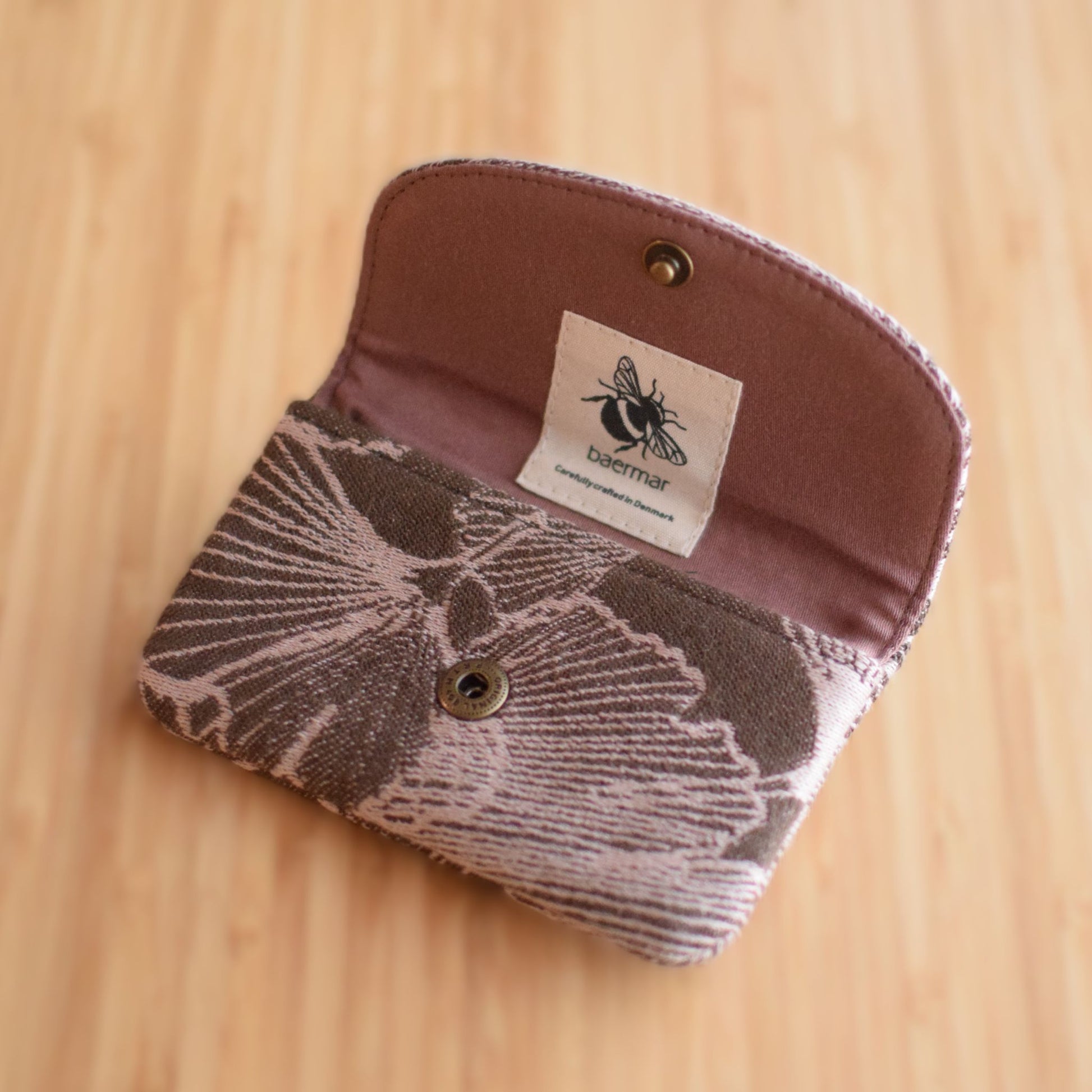 Praktisk og fin pung med to-delt inderrum samt lynlåsrum bagpå. Der er plads til kort, mønter og andre småting, og lukkes med trykknap. Viklestoffet er fra Levate og pungen er foret med rosa bomulds-satin.