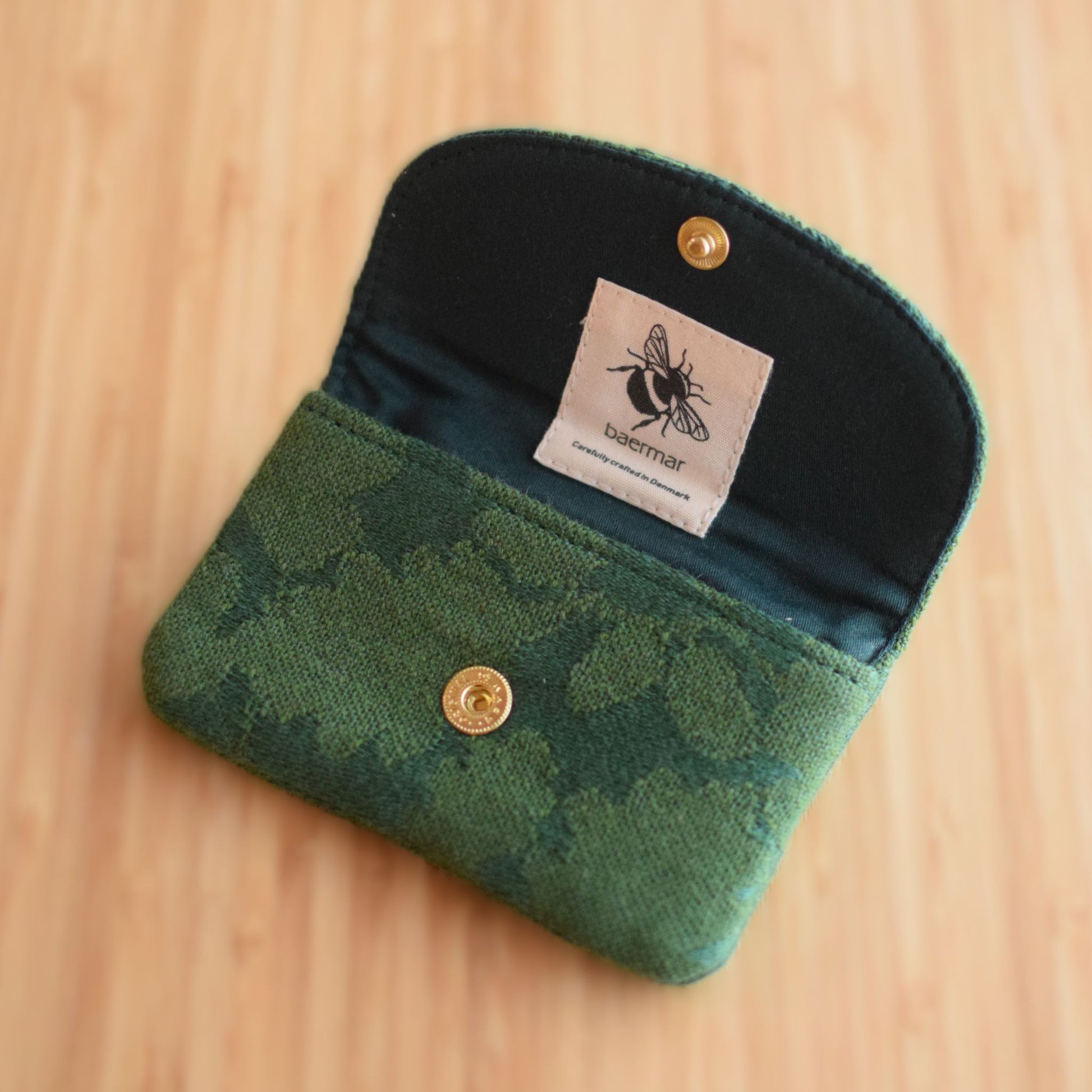 Praktisk og fin pung med to-delt inderrum samt lynlåsrum bagpå. Der er plads til kort, mønter og andre småting, og lukkes med trykknap. Viklestoffet er fra Nordic Slings og pungen er foret med grønt bomulds-satin.