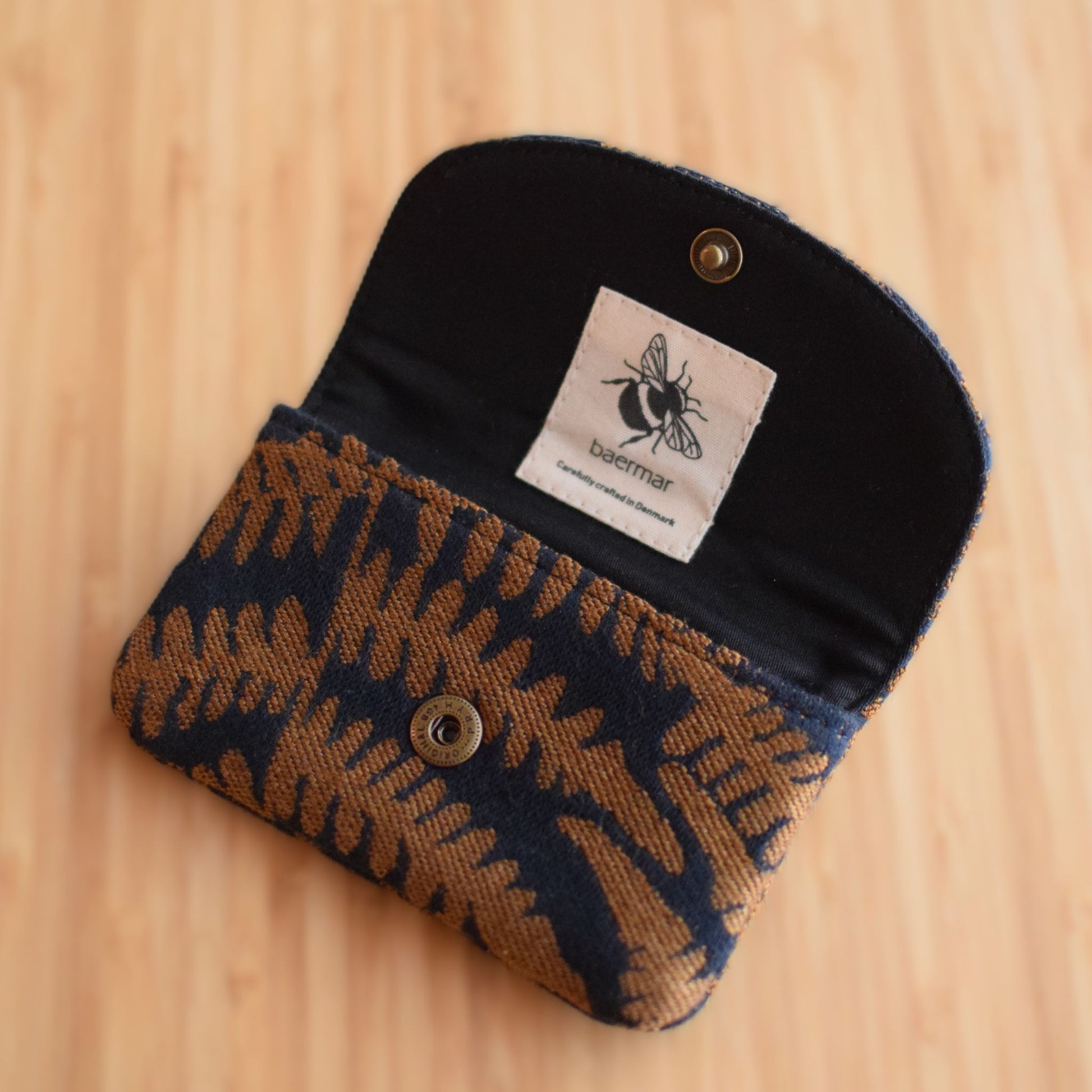 Praktisk og fin pung med to-delt inderrum samt lynlåsrum bagpå. Der er plads til kort, mønter og andre småting, og lukkes med trykknap. Viklestoffet er fra Sling Studio og pungen er foret med sort bomulds-satin.