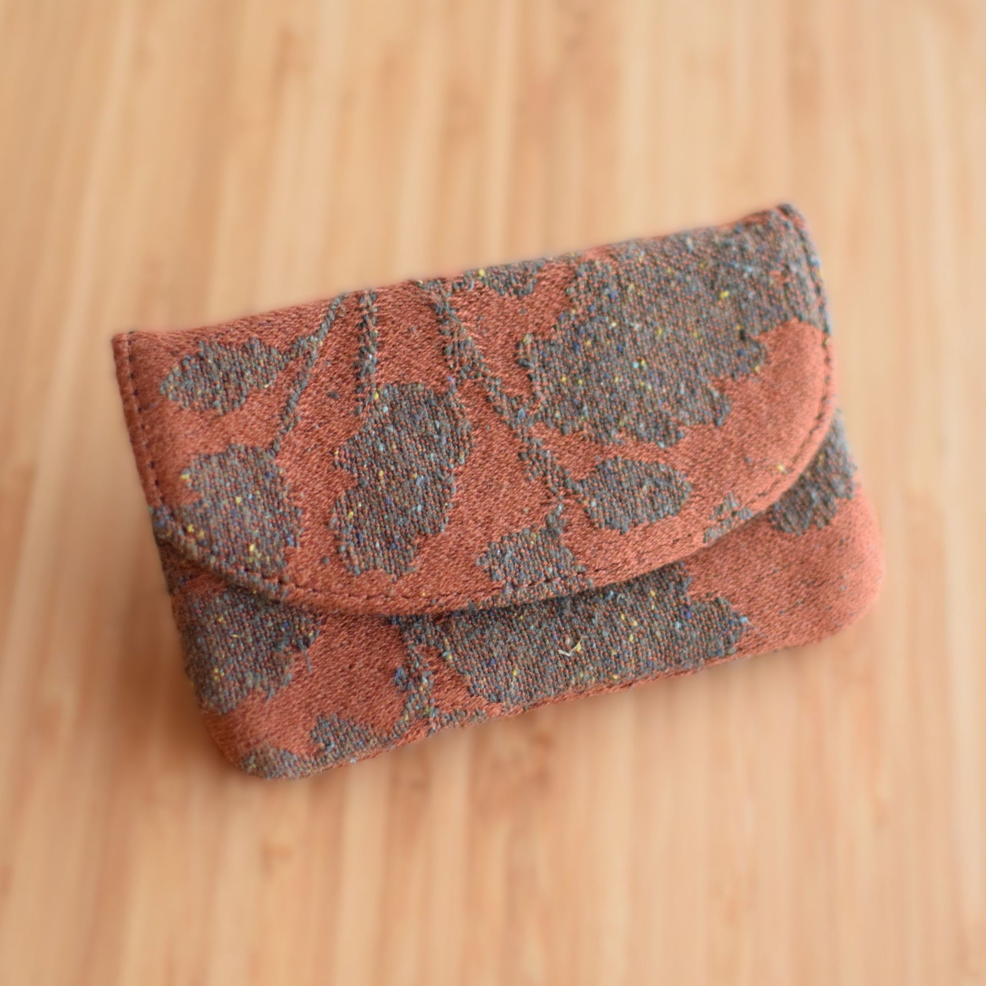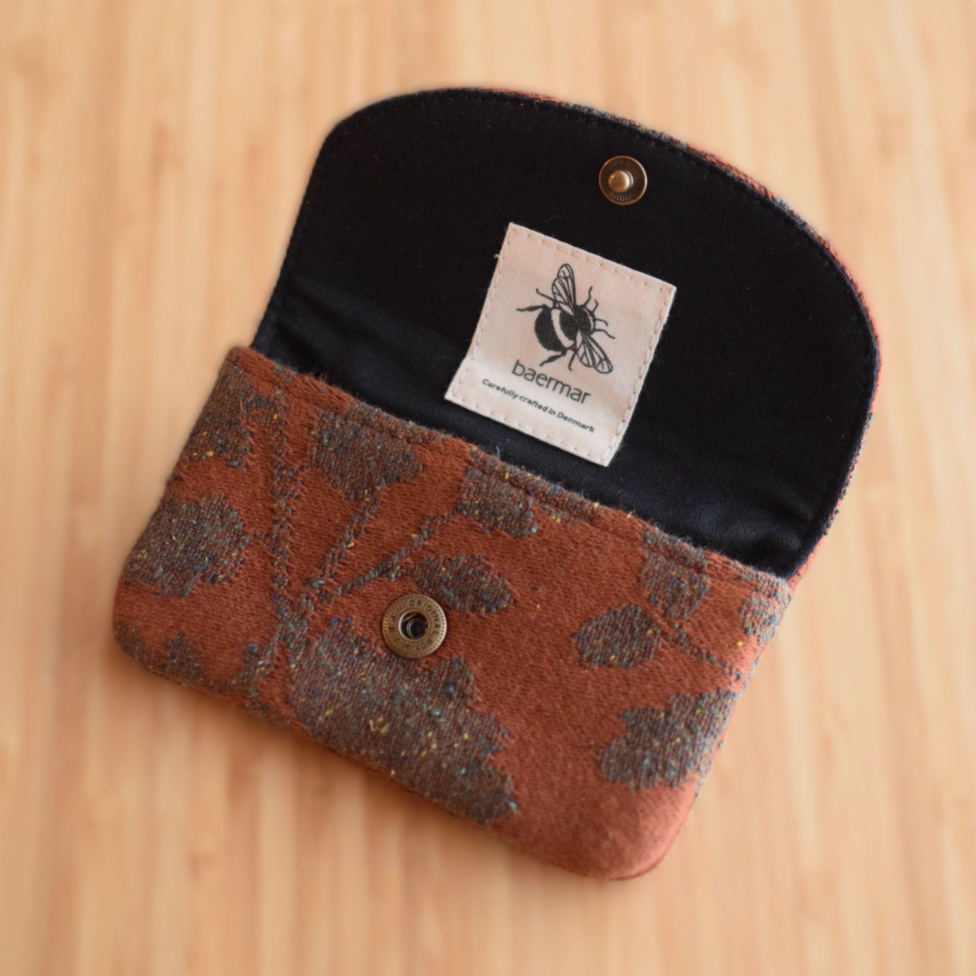 Praktisk og fin pung med to-delt inderrum samt lynlåsrum bagpå. Der er plads til kort, mønter og andre småting, og lukkes med trykknap. Viklestoffet er fra Nordic Slings og pungen er foret med sort bomulds-satin.