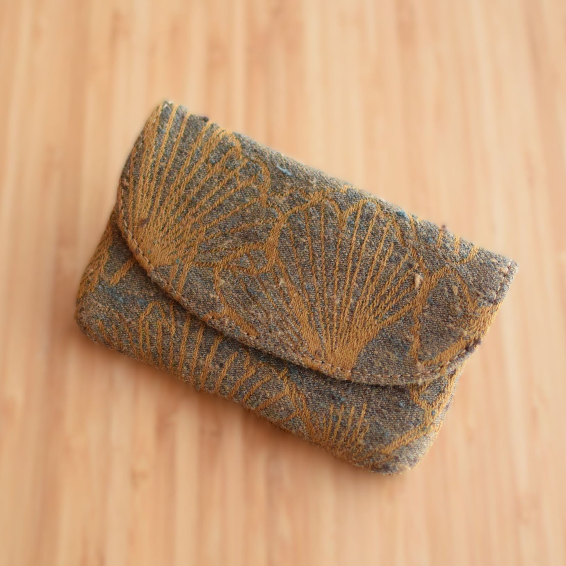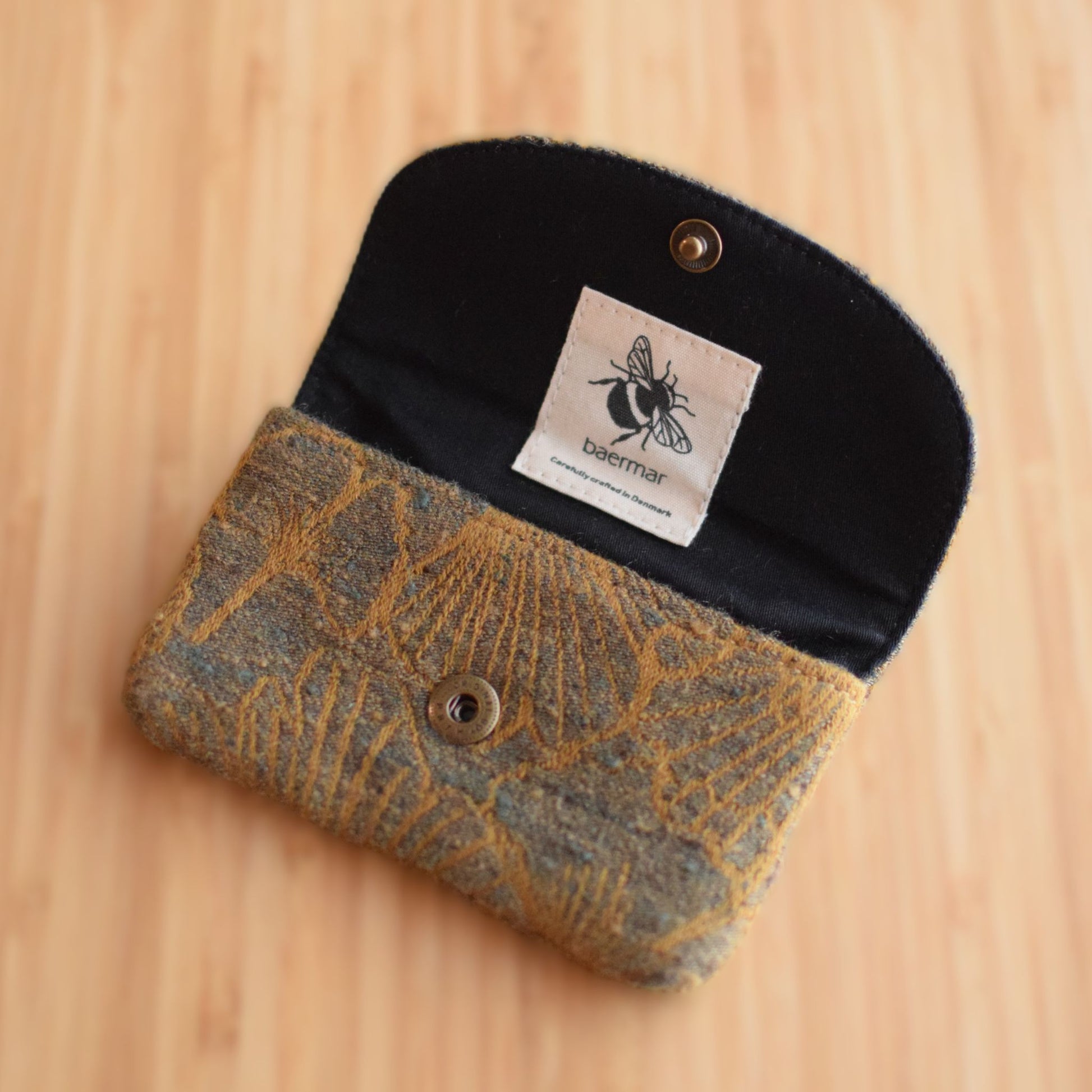 Praktisk og fin pung med to-delt inderrum samt lynlåsrum bagpå. Der er plads til kort, mønter og andre småting, og lukkes med trykknap. Viklestoffet er fra Levate og pungen er foret med sort bomulds-satin.